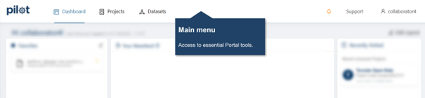 • Navigation links. Click to navigate between Portal pages including Dashboard, Projects, and Datasets.