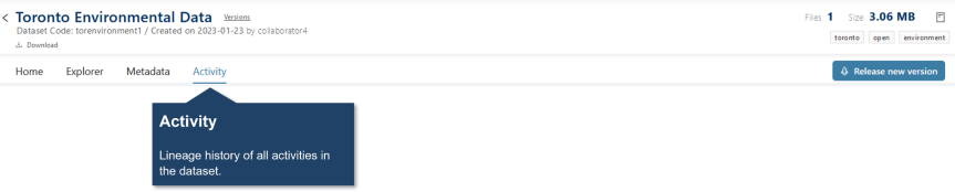 Changes made to a Dataset are tracked in real time and can be viewed at any time in the Activity tab. This lineage record displays all the historical actions in a Dataset starting with the time of Dataset creation, including who performed the action and when it was performed, .